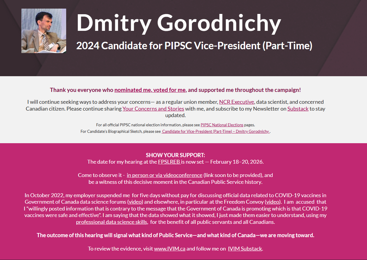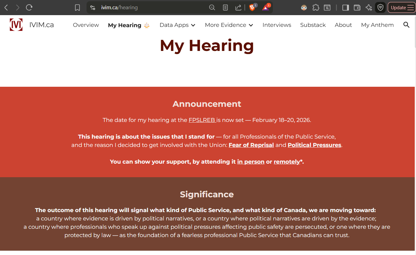 JAN 26: A page is created on IVIM.ca portal dedicated to My Hearing: IVIM.ca/hearing. This is where all details about the Hearing and all related evidence - including my analysis of PHAC and StatsCan data, and communications with my Employer and the Union - will be posted. You may wish to bookmark this page, as this hearing will decide the future of Public Service and Canada.