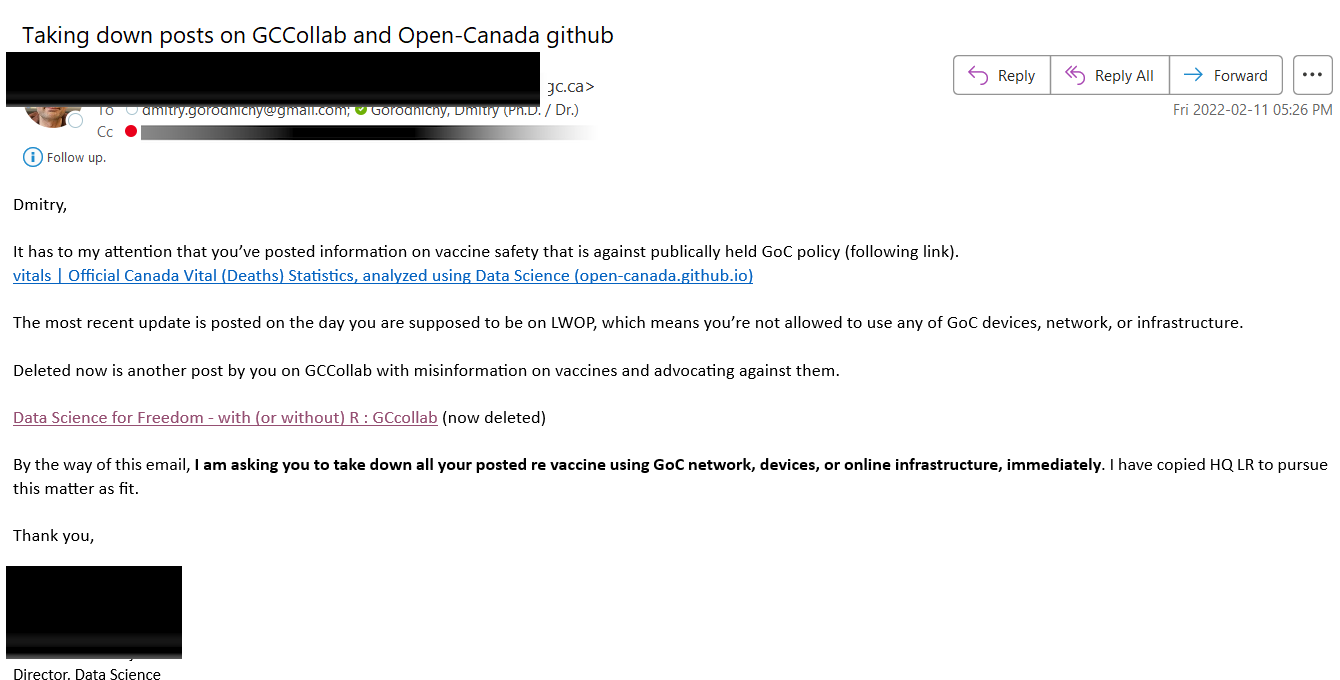 In October 2022, my employer suspended me for five days without pay for discussing official data related to COVID-19 vaccines in Government of Canada data science forums (video) and elsewhere, in particular at the Freedom Convoy (video). I am accused that I “willingly posted information that is contrary to the message that the Government of Canada is promoting which is that COVID-19 vaccines were safe and effective”. I am saying that the data showed what it showed, I just made them easier to understand, using my professional data science skills, for the benefit of all public servants and all Canadians.